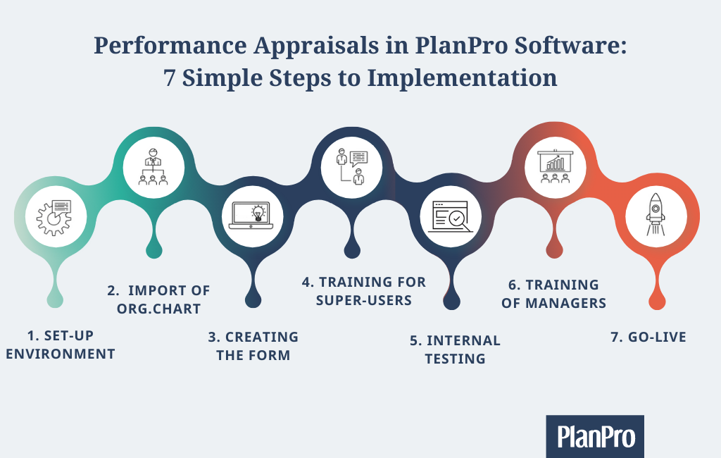 As you might already know, PlanPro performance appraisal software module is a flexible tool for conducting different performace reviews and collecting feedback, including performance appraisal, onboarding of new employees, exit interviews, 360-degree feedback, employee engagement surveys etc. The implementation process includes 7 simple steps.